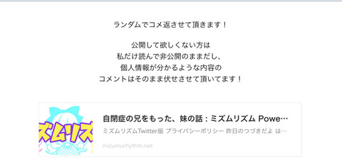 2020年08月27日 自閉症の兄をもった、妹の話31 ✨重要なお知らせ✨今後のコメントの扱いですが、コメント公開にする事で沢山の方が喜んでくださったので、返信はまた不定期にはなりますが、一旦コメントを承認制にします!ほとんどのコメントは承認し、公開にしますので、公開にして欲しくない、私だけに思いを綴ってくだ ... 続きを読む ✨重要なお知らせ✨今後のコメントの扱いですが、コメント公開にする事で沢山の方が喜んでくださったので、返信はまた不定期にはなりますが、一旦コメントを承認制にします!ほとんどのコメントは承認し、公開にしますので、公開にして欲しくない、私だけに思いを綴ってくださる方はその旨をコメントに残して頂けると幸いです(もしくは空気を読みますw)前回の続きだよ! 自分のために自分の人生を生きる、という言葉をくれた母でしたが…兄の為に存在しているとずっと思い込んで生きてきたので、どうしたらいいか分からぬまま、大人になりました。呪詛。↓これも読んでみよう!↓インスタのストーリーとTwitterのツイートの内容と全く違う事呟いてるのでよかったら両方どうぞ!!